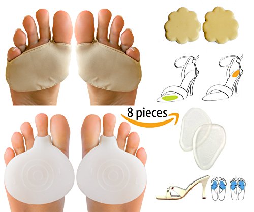 - SUPERIOR BUNDLE, VARIETY OF USES: 8 Pieces (4 Pair) per pack - Soft silicone gel cushions help reduce pressure from the toes and metatarsals while providing maximum all day comfort and shock absorption to the sensitive tissue at the ball of the foot.